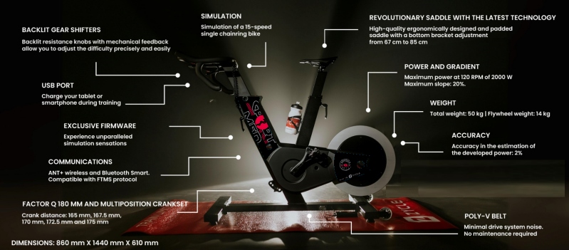 - Versnellingstoetsen (voor het regelen van de weerstand) aan het stuur waardoor je schakelt zoals met een elektrische groepset op een racefiets of gravelbike.